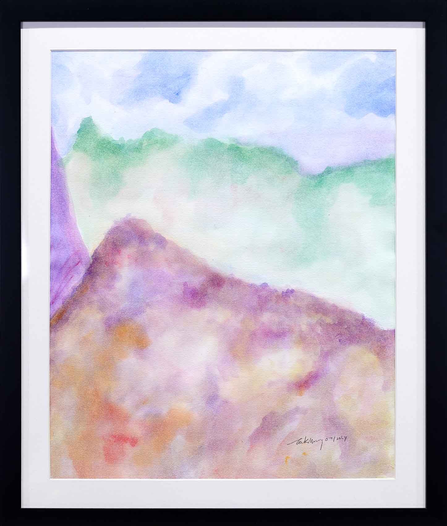 这幅作品中,山与天交汇,颜色轻柔晕染,如同一场高山与天空间温柔的对话。紫色、绿色、褐色各自闪耀,不争不抢,互相搭配。在大自然的世界里,没有谁是最强的,只有和谐、包容与平衡。正如人生,有时我们执着于比较,却忘了真正的力量,是懂得欣赏别人、一起成长。
